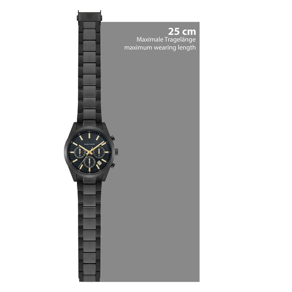 ALLGEMEINE INFORMATIONEN: Zielgruppe: Herren Armbanduhr: Chronograph Anzeige (Display): analog UHRWERK: Uhrwerk: Quarzwerk Herkunft Uhrwerk: Japan ARMBAND: Armbandmaterial: Edelstahl Armband-Beschichtung: Ionenplattierung (IP) Armbandoberfläche: poliert/satiniert Armband-Verschluss: Sicherheits-Faltschließe Armbandfarbe: schwarz Armbandlänge (mm) -...