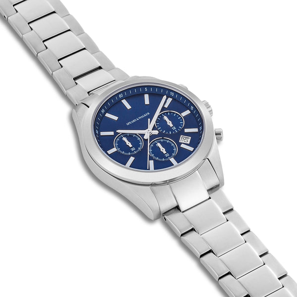 ALLGEMEINE INFORMATIONEN: Zielgruppe: Herren Armbanduhr: Chronograph Anzeige (Display): analog UHRWERK: Uhrwerk: Quarzwerk Herkunft Uhrwerk: Japan ARMBAND: Armbandmaterial: Edelstahl Armband-Beschichtung: keine Armbandoberfläche: poliert/satiniert Armband-Verschluss: Sicherheits-Faltschließe Armbandfarbe: silber Armbandlänge (mm) - ca.:...