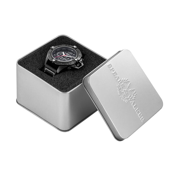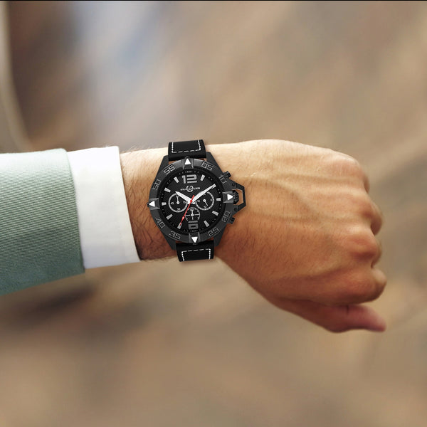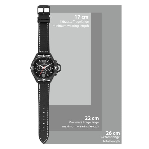 ALLGEMEINE INFORMATIONEN: Zielgruppe: Herren Armbanduhr: Chronograph Anzeige (Display): analog UHRWERK: Uhrwerk: Quarzwerk Herkunft Uhrwerk: Japan ARMBAND: Armbandmaterial: Echtleder Armband-Beschichtung: keine Armbandoberfläche: glatt Armband-Verschluss: Dornschließe Armbandfarbe: schwarz Armbandlänge (mm) - ca.:...