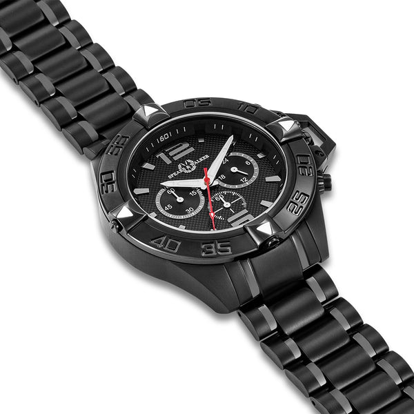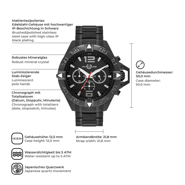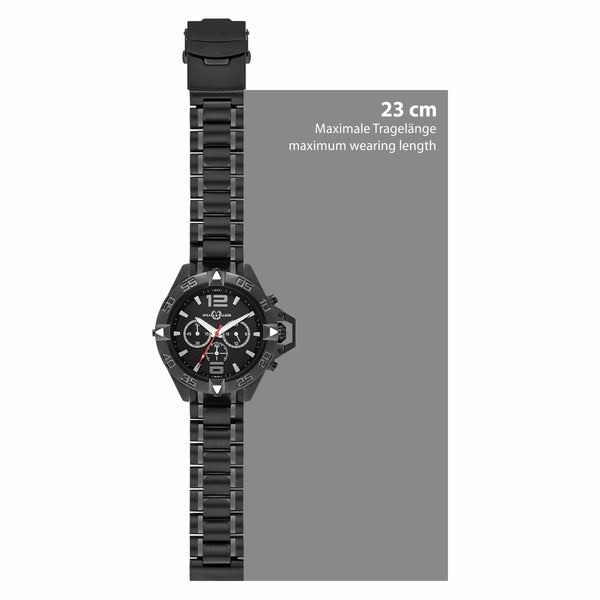 ALLGEMEINE INFORMATIONEN: Zielgruppe: Herren Armbanduhr: Chronograph Anzeige (Display): analog UHRWERK: Uhrwerk: Quarzwerk Herkunft Uhrwerk: Japan ARMBAND: Armbandmaterial: Edelstahl Armband-Beschichtung: Ionenplattierung (IP) Armbandoberfläche: mattiert/poliert Armband-Verschluss: Sicherheits-Faltschließe Armbandfarbe: schwarz Armbandlänge (mm) -...
